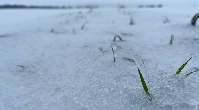 Озима пшениця на полях Групи АГРОТРЕЙД добре перезимовує під снігом: посіви рівномірні, зелені стебла живі, без ознак вимерзання чи критичних пошкоджень.