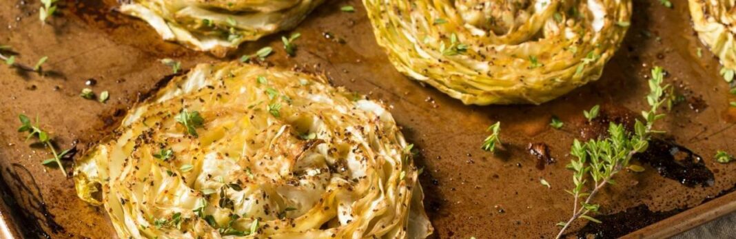 Капусту нарізати товстими скибками-«стейками», змастити олією та спеціями. Запікати 30–35 хвилин при 190 °C до золотистої скоринки. Подавати з соусом із йогурту, часнику та лимонного соку.