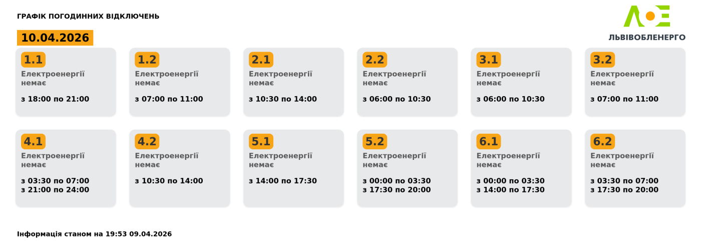 Група 6.2. Електроенергії немає з 03:30 до 07:00, з 17:30 до 20:00.