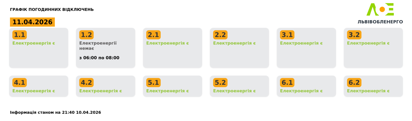 Графік погодинних відключень на 11.04.2026