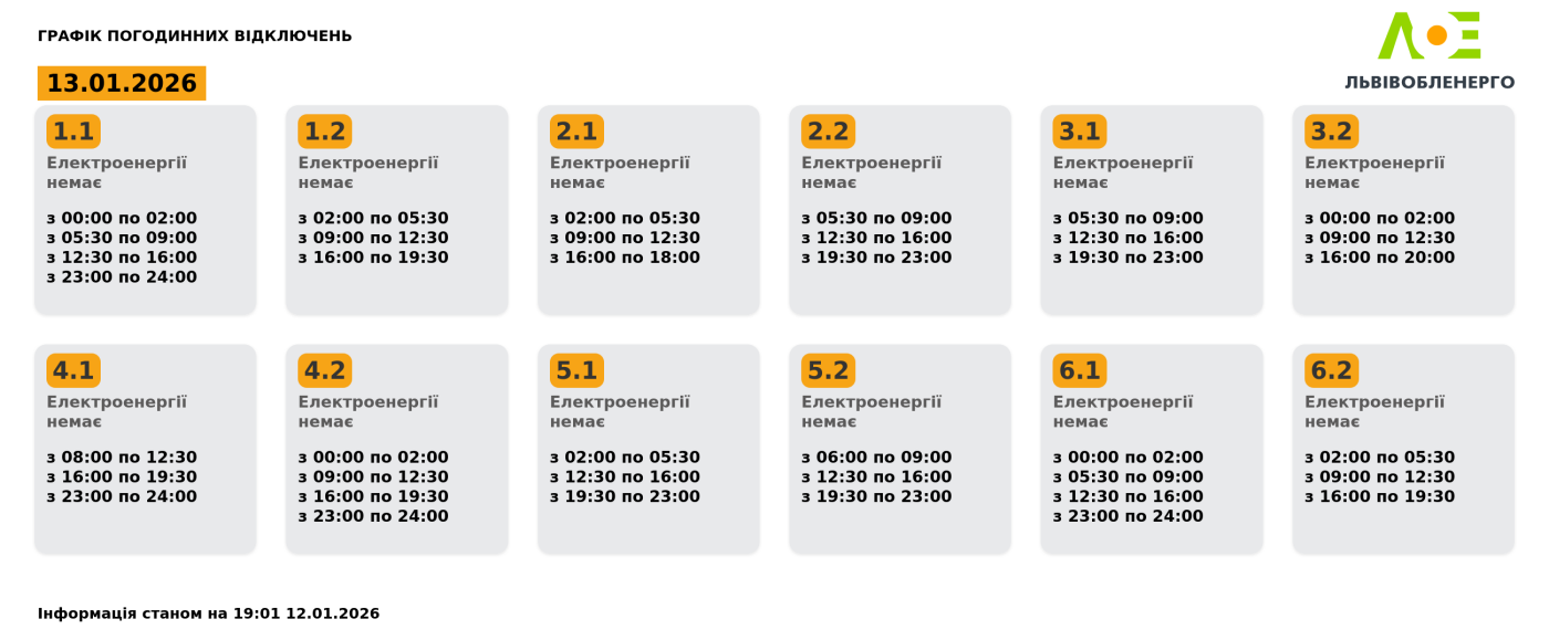Група 3.2. Електроенергії немає з 00:00 до 02:00, з 09:00 до 12:30, з 16:00 до 20:00.