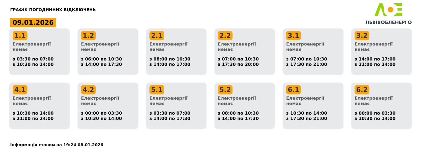Графік погодинних відключень на 09.01.2026