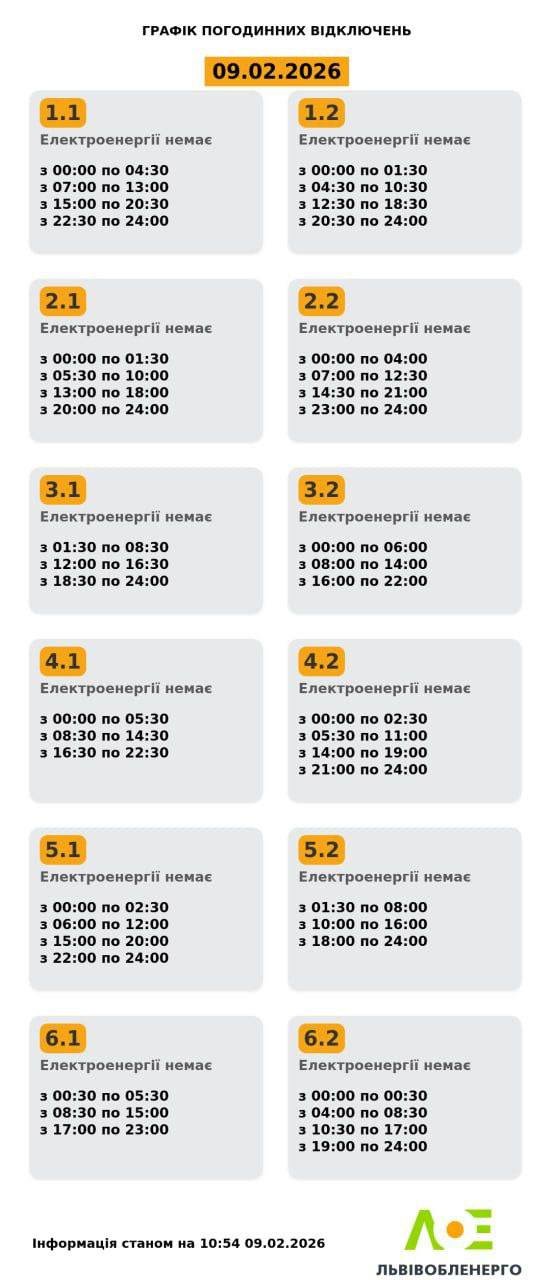 Львівобленерго оновило графіки відключень світла на Львівщині на 9 лютого.