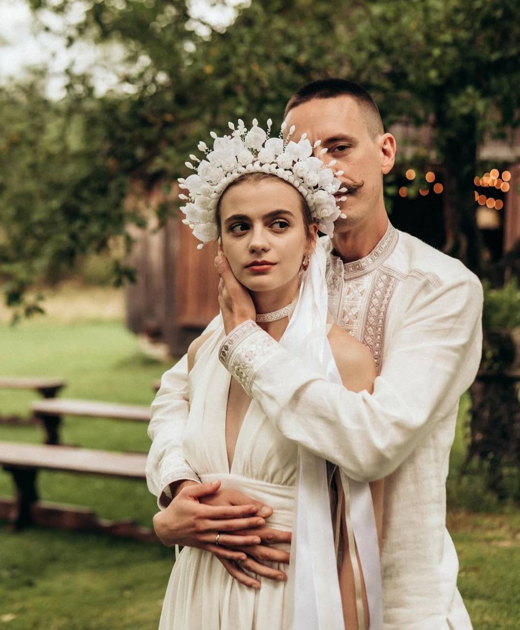 На фото Дарина постала у ніжному етнічному образі — у світлій сукні з довгими рукавами та вінком із білих квітів і стрічок. Її обранець – у світлій вишиванці, на знімках він ніжно обіймає акторку.