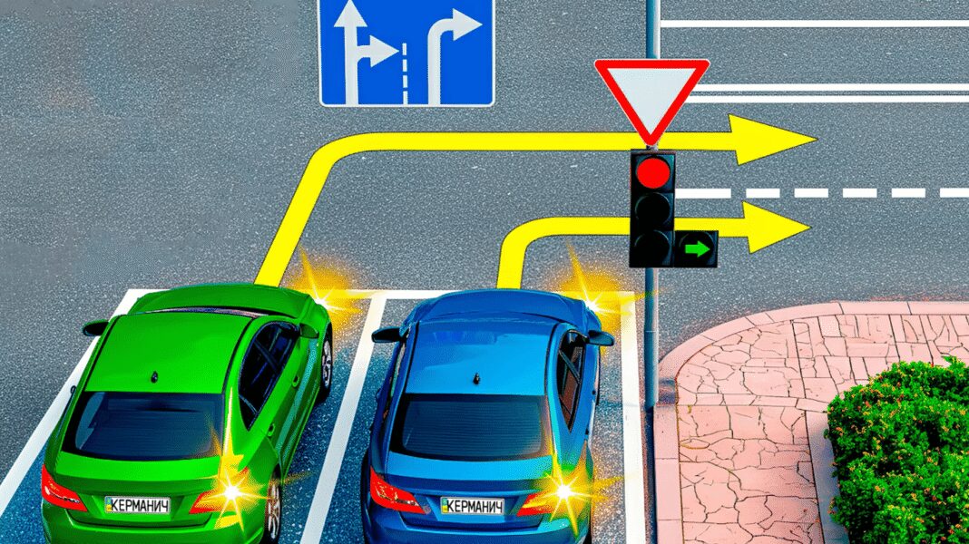 За пунктом 8.7.3 (е) ПДР, зелена стрілка дозволяє рух у вказаному напрямку за умови надання переваги іншим транспортним засобам. Згідно з пунктом 8.7.3 (б), дія стрілки поширюється на всі смуги, з яких дозволено поворот у цьому напрямку згідно зі знаками. Позаяк знак 5.16 дозволяє поворот з обох смуг, то обом водіям можна повернути праворуч.