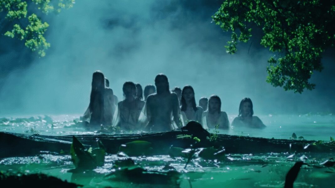 Особливу увагу привертають три довгокосі русалки, що контролюють мавок. Під чудернацьким гримом і в костюмах від Анни Осмехіної (бренд TTSWTRS) ми впізнаємо Олесю Романову, Юлію Буйновську та Роксолану Валівоць. Вони не просто прикрашають кадр — їхні персонажі впливають на хід історії, і без них неможливо уявити сюжет.