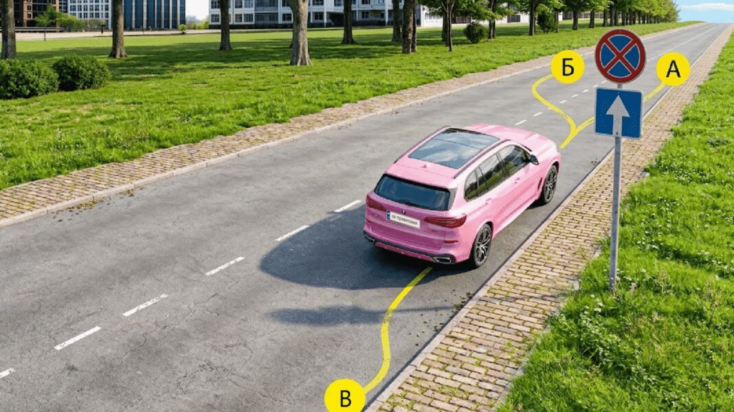Задача з теми про зупинку та стоянку. Водієві пропонуються три варіанти паркування. Один до знаку 3.34 "Зупинку заборонено", два — за ним (точки А, Б та В). В якому місці дозволяється здійснити зупинку водієві рожевого автомобіля без порушення правил у зображеній на малюнку ситуації?