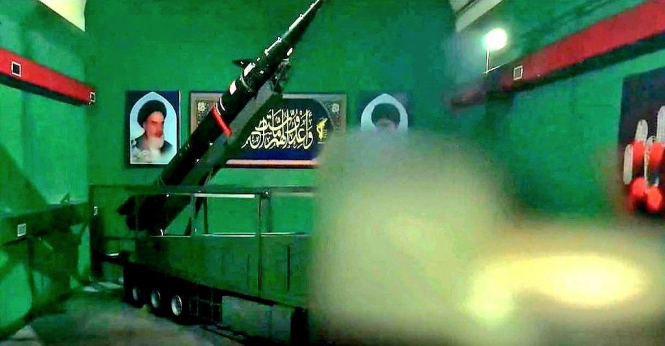 Внутрішня частина одного з "ракетних міст" ВПС КВІР, як і годиться, оздоблена плакатами, і балістична ракета Fattah-1.